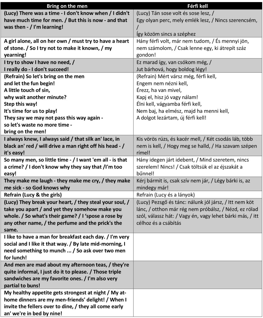 Éppen ezért választottam ki Lucy dalát, mert azon tökéletesen látszik, hogy mennyire más szereplőt írtak az eredeti örömlány helyett. Ami rögtön szembetűnik az az, hogy a dal igazán odamondós részei egyszerűen nem kerültek átültetésre magyarul. De a legarcátlanabb módosítás az, hogy az önmagát szerető, elfogadó, a nőiségét és a férfiak iránti vágyait felvállaló Lucyból egy öngyűlölő, a saját sorsát megvető örömlány lett.