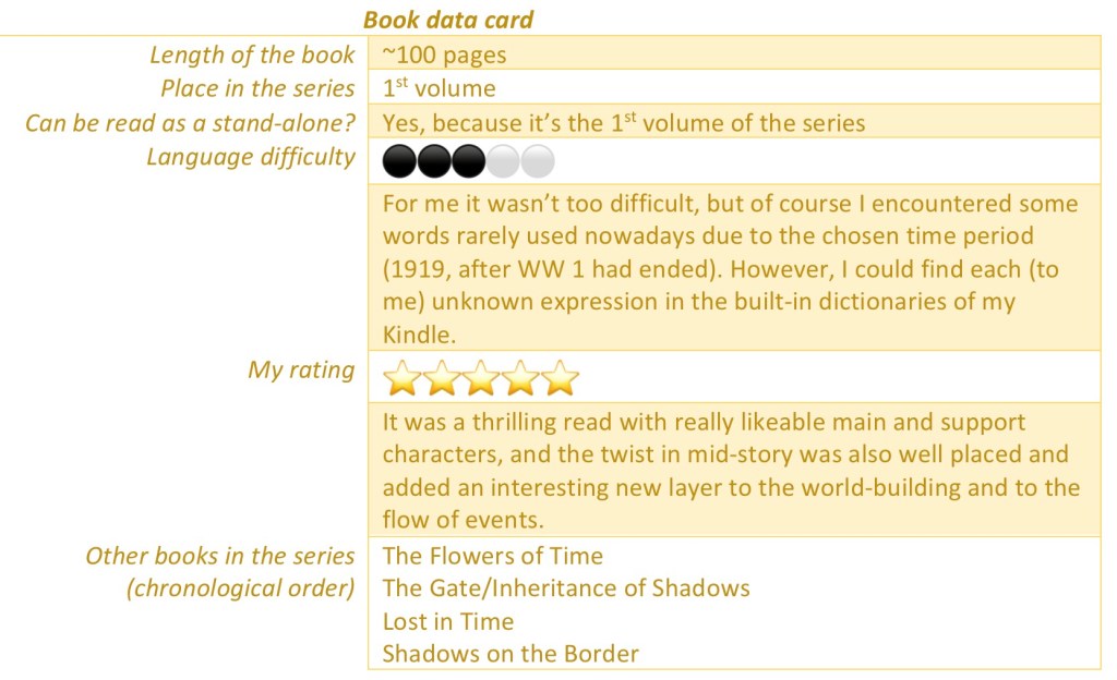 Matty and Rob from “The Gate” (1st volume of the Lost in Time series) are back in Inheritance of Shadows! The book picks up the thread right at where the original short story left the two main characters. This novel also contains the events of the short story (Chapter One: The Gate). And I was really happy to get my hands on this book, because I always felt Matty and Rob’s story was unfinished and wanted a real closure and a happily ever after for them.
