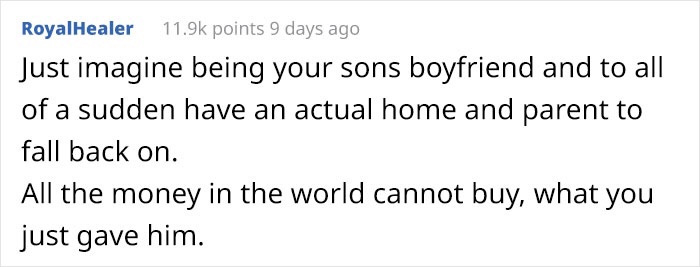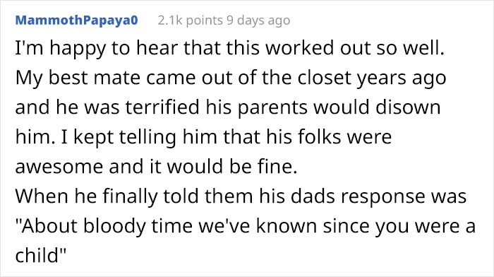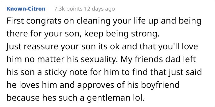 Egy apa egészen biztosan észrevette ezeket a változásokat. Azután, hogy a fia és a barátja hazajöttek, hogy együtt töltsék az időt a világtól elvonultan, az apa rájött, hogy ők ketten egy párt alkotnak. Már korábban, a fia kamasz évei alatt is “erős volt a gyanúja” a dolgok állásával kapcsolatban, de most “többé kevésbé meg tudott győződni arról, hogy a gyanúja helyes.” Viszont könnyebb bármit válaszolni a kérdésre, amit feltett a Reddit felhasználóknak, mint megtenni belőle bármit is: “Hogy adjam a tudtukra, hogy ez az egész rendben van?” És ezek után semmi perc alatt ő lett a legnépszerűbb apa az egész interneten több, mint 55 ezer like-al, és mindenki azért könyörgött neki, hogy fogadja őket örökbe. Egyébként a történet nem ér véget ennyivel, mert az apa visszatért, hogy elmesélje, hogy alakultak a dolgok.