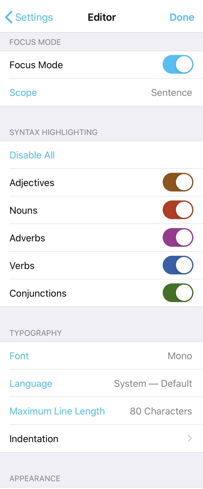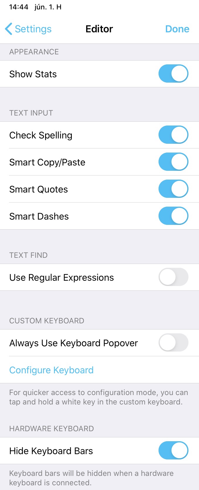 Egyébként nem sok beállítási opció van az iA Writerben, pontosan annyi, amit ezen és az az eggyel lentebbi képen láthattok.
