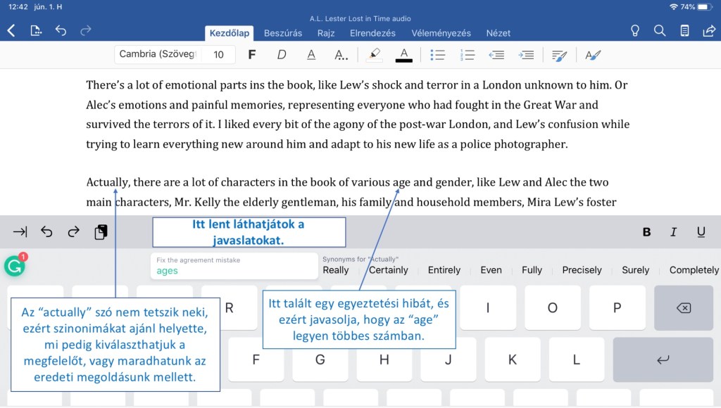 Itt láthattok is egy képernyő fotót, amin ezeket mutatom, magyarázatokat is fűztem a képhez, hogy könnyebben érthető legyen, hogyan is működik a Grammarly.