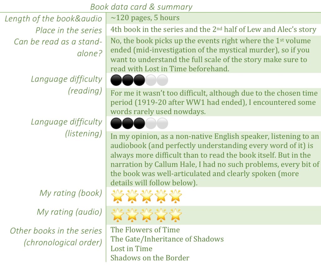 Shadows on the Border is narrated by Callum Hale, same as Lost in Time was, and the quality of the narration is exactly as perfect as it was in the previous book. All the characters are back from Lost in Time, and they are represented during the narration with full of care, attention and tenderness.