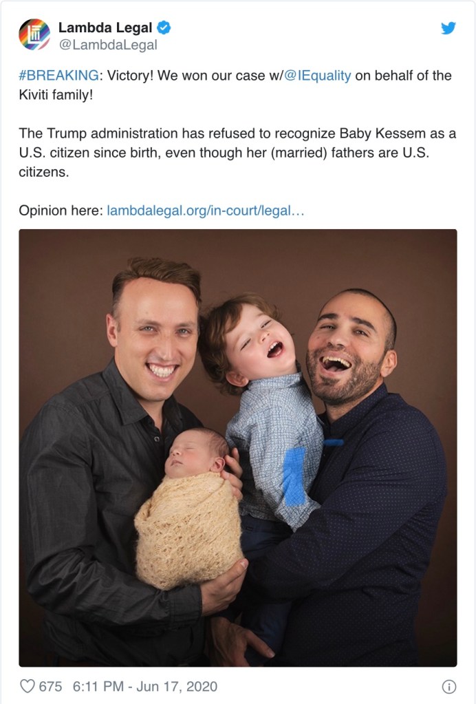 “Az eheti Legfelsőbb Bírósági győzelem megerősíti azt, hogy az LMBT emberek nem iktathatók ki azokból a törvényekből, amik megtiltják a diszkriminációt a munkavállalásban, a mai győzelem ismételten megerősíti azt, hogy a házas, azonos nemű párok sem iktathatók ki a törvényekből, amik a házassághoz köthetőek, mint például a Bevándorlásról és Állampolgárságról szóló törvény. Ez a törvény nem tesz különbséget a házasságban született gyermekek között attól függően, hogy azonos vagy eltérő nemű párok gyermekei-e. Ahogy a bíróság is kijelentette, ha így tenne, az megsértené a törvény egyértelmű kitételeit, és súlyos alkotmányos aggodalmakat vetne fel” mondta Omar Gonzales-Pagan, a Lambda Legal vezető ügyésze, aki a család egyik ügyvéde is. “A törvény biztosítja olyan külföldön született gyermekek számára az állampolgárság elismerését, akiknek a szülei házas amerikai állampolgárok. Ez a kitétel egyenlően vonatkozik minden párra függetlenül attól, hogy a szülőknek van-e biológiai kötődése a gyermekhez. Érzéketlen és diszkriminatív lépés volt a külügyminisztériumtól, hogy elutasította a kis Kessem amerikai állampolgárságának az elismerését, holott egyértelműen az. A mai győzelem arra is rámutat, hogy mennyire törvénytelenek voltak a külügyminisztérium lépései ebben az ügyben.”