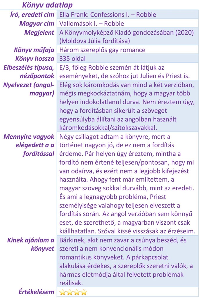 Már korábban is írtam magyarul elérhető gay romance regényekről, ilyen volt a Him – Ez a srác. Most pedig egy újabb magyarul is elérhető könyvet választottam, ez pedig nem más, mint Ella Frank Confessions (Vallomások) sorozatának első része.