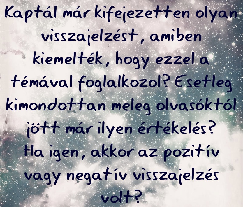 Igen, többen emelték már ki eddig, hogy örülnek annak, amilyen témában írok, sőt hogy történelmi melegregényt írtam, hiszem ez az alkategória még alulreprezentáltabb, mint maga az LMBTQ zsáner. De hogy a visszajelzők közül ki meleg, azt nem tudom, ezt nem írták bele az értékelésekbe.És természetesen kaptam negatív visszajelzéseket is. Finoman megfogalmazva, a legtöbbnek annyi volt a lényege, hogy már a kiadót sem értik, hogy minek enged ilyen szemetet megjelenni.