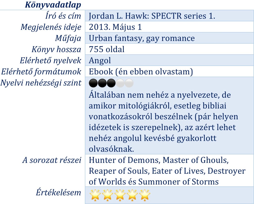 Teljesen véletlenül bukkantam rá Jordan L. Hawk SPECTR sorozatára, amikor az egyik m/m könyves csoportban valaki azt kérte, hogy ajánljanak neki olyan könyveket, amikben az egyik főszereplőt megszállja valami. Eleve szeretem az ilyen könyveket, bár az a tapasztalatom, hogy nem sokszor sikerül jól használni a témában rejlő lehetőségeket. Mert a főszereplőt megszálló incubusoktól és succubusoktól mentsen meg minket az ég…