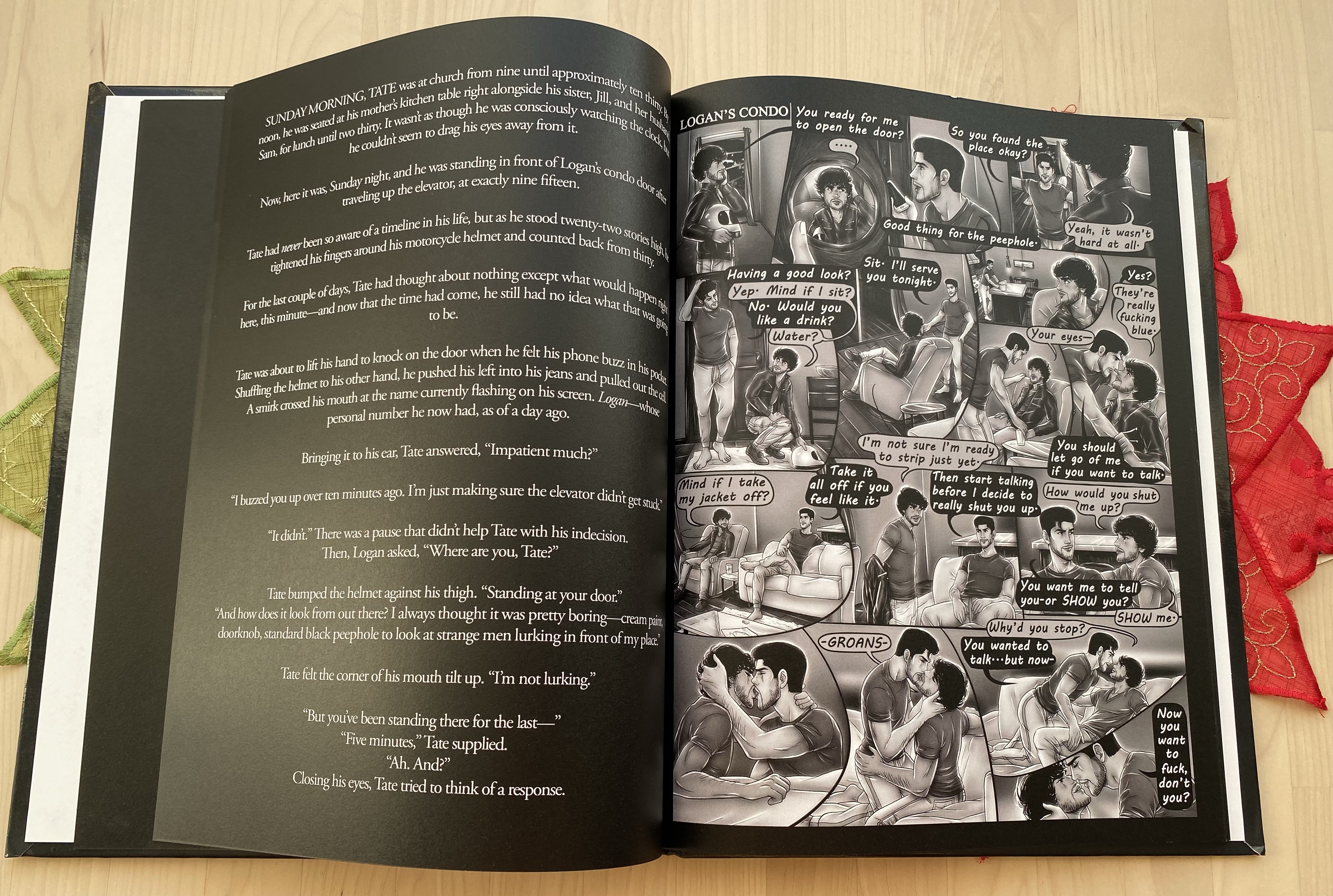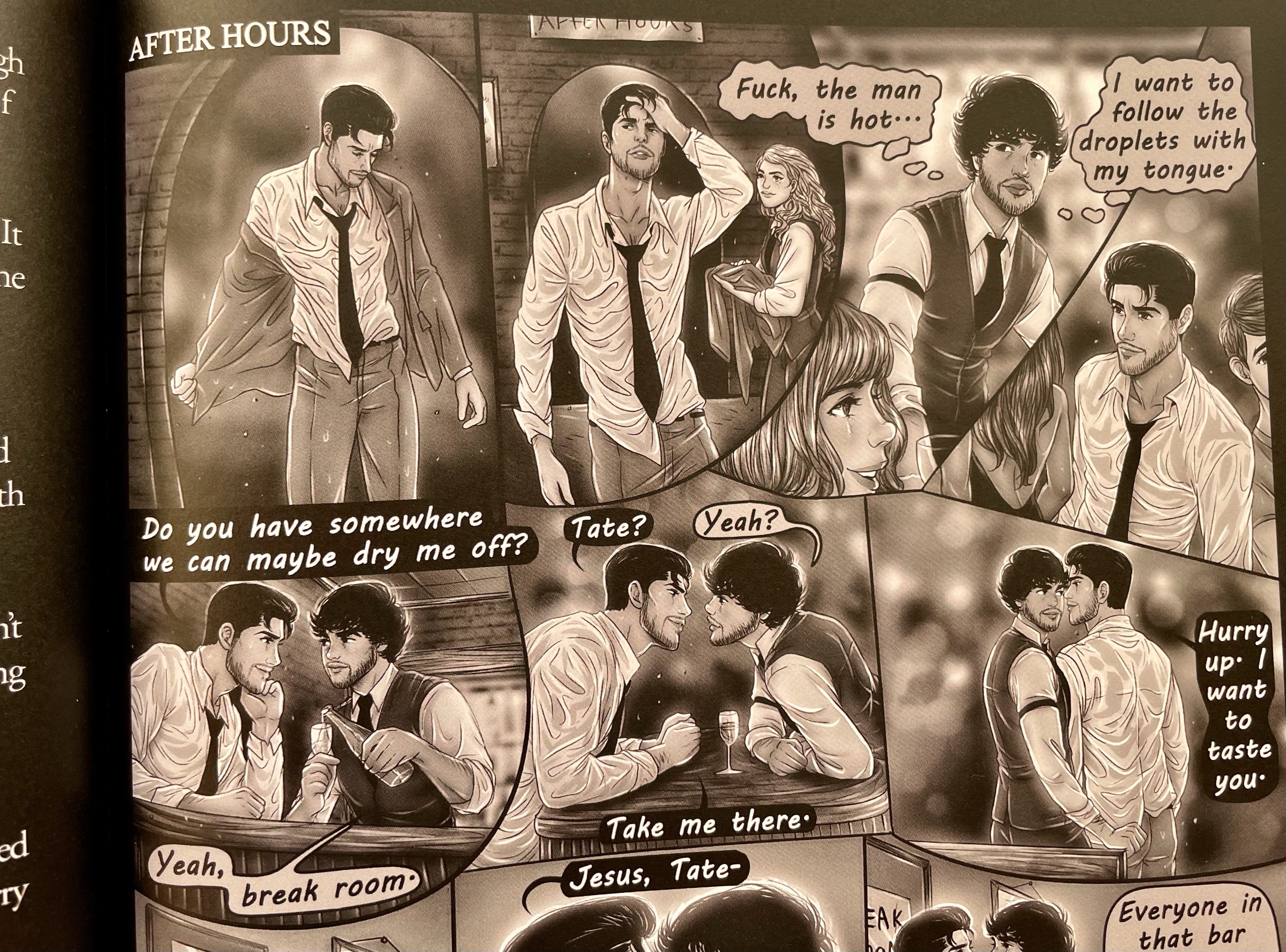 A graphic novelben egyébként ábrázolásra került több intim jelenet is – aki már olvasott Ella Franktól, biztosan tudja, hogy az írónő mennyire nem szégyenlős, ha ilyen jeleneteket kell írnia, és éppen ezért a történések megjelenítésében sem hagy sok helyet a képzeletnek. Ez is az egyik oka, hogy annyira nem a kedvenceim a könyvei, én nagyon gyorsan telítődök a szex jelenetekkel, úgy meg különösen, ha oldaltöltésnek érzem. Viszont éppen azért, mert Ella Frank ennyire bátran áll az erotikus jelenetek leírásához, ez megjelenik az illusztrációkban is, úgyhogy ezekben az esetekben garantáltan nem kell találgatnia az olvasónak, hogy mit olvas éppen.