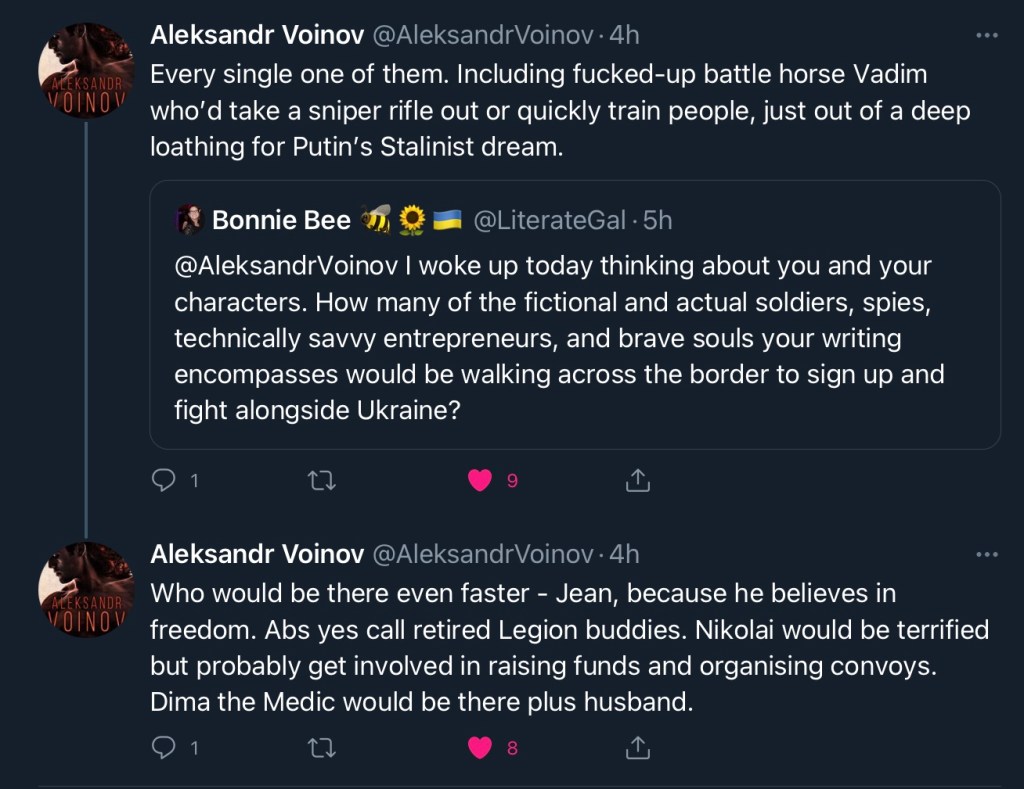 @AleksandrVoinov Úgy ébredtem fel ma, hogy rád és a karaktereidre gondoltam. Hogy hányan lennének elképzelt és valódi katonák, kémek, igazi dörzsölt üzletemberek, bátor lelkek, akikről a könyveid szólnak, vajon ők átkelnének a határon, hogy bevonuljanak, és hogy Ukrajna mellett harcoljanak?