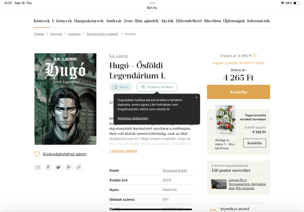 A Libri rostáján fennmaradt könyveimet “Érzékeny tartalom” címkével látták el. Ha valaki erre rákattint megjelenik egy figyelmeztetés, miszerint a könyv jogszabály alá eső érzékeny tartalmú kiadvány, ami miatt egyes Libri üzletekben nem forgalmazható és nem vehető át. Amennyiben pedig az „egyes” a forgalmazás esetében az ÖSSZES üzletüket jelenti, úgy nem állítanak valótlant.