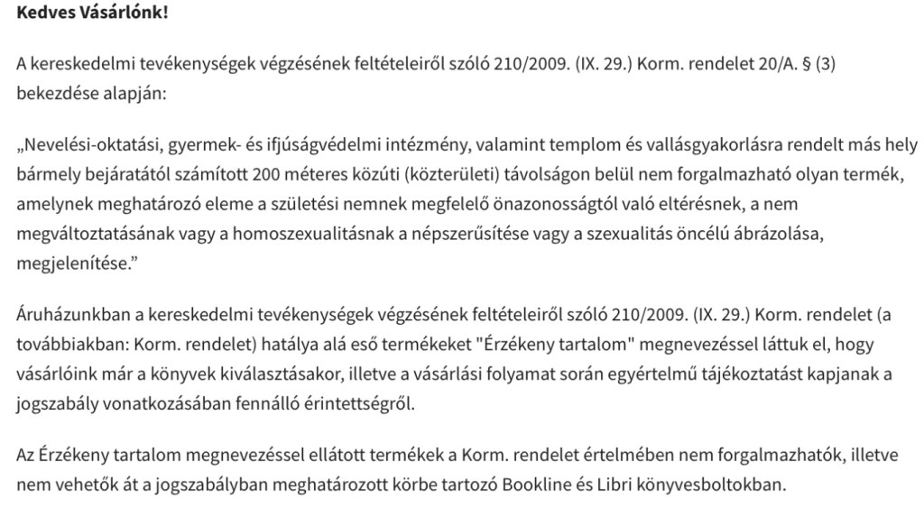 Ha azt gondolnánk, hogy ez csak szélsőséges eset lehet, akkor mindenkit ki kell ábrándítsak, hogy nem az. Ha megnézzük a Bookline „érzékeny tartalmú könyvek forgalmazásáról” szóló irányelveit, ott feketén fehéren le van írva, hogy bizonyos helyeken nem forgalmazható, és nem vehető át a szabályozás hatálya alá eső könyv.