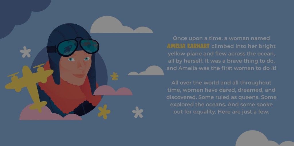 Valamikor régen élt egy Amelia Earhart nevű nő, aki egyszer bemászott a sárga repülőgépébe, és átrepült az óceán fölött. Nagyon bátor dolgot vitt véghez, és Amelia volt az első nő, akinek ez sikerült!