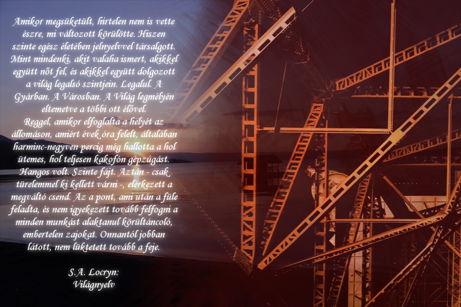 Aki Gyár szintjére született, tudja, hogy csak lefelé, a felszínre, vagy a föld alá, a bányákba mehet. A felsőbb szintek elzárattak előlük. De aki ennyire lentre született, vágyik-e egyáltalán felfelé úgy, hogy sosem, látta az eget, sosem ismerte a természetet, nem látott soha mást a kohók vörösén kívül, és nem hallott mást egész életében, mint gépzúgást? Amíg hallott… A legalul élők nyelve, a zajban is érthető jelek azok, amiket a város minden szintjén valamennyire megértenek.